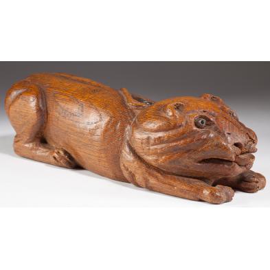 19th century, carved oak with glass bead eyes, drilled vertically for attachment, probably an element from a larger piece, possibly the arm rest from a pew or chair.