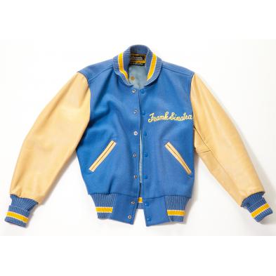 Light blue and yellow wool jacket with cream colored leather sleeves, "Frank Sinatra" embroidered across left breast, "Chargers" stitched across back, interior label reads: "Coleman Knitting Mills, INC., Ogden, Utah, Especially For Frank Sinatra." Measurements: Size 40 (approximate); (Shoulder to shoulder 19 in.); (Sleeve length 26.75 in.).