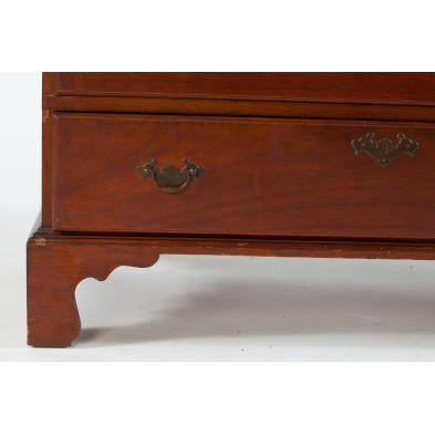 Circa 1800, walnut with white pine, dovetailed case, lipped lid with breadboard ends opens to reveal valanced cubbies over serpentine drawers centered with a shell carved prospect; four graduated lipped drawers on a shaped bracket foot base. Old surface patina.