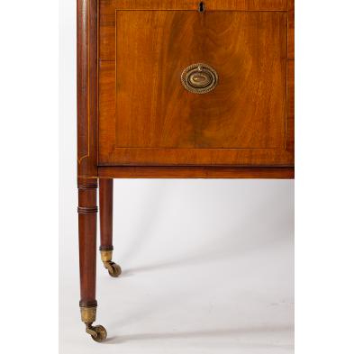 Circa 1810, mahogany, mahogany veneers with oak and pine secondary woods, solid shaped top with triple reeded edge over drawers, the bottom left deep drawer with original divided tin liner. All drawers with cock-beading and light and dark line inlay, case raised on six turned tapered legs on casters.