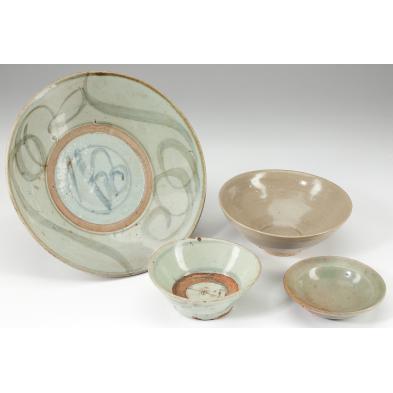 Including a small bowl with underglaze decoration (2 x 5 1/8 in. diameter) (some roughness to rim); the second a low dish with grayish green celadon glaze (1 1/8 x 4 5/8 in. diameter); the third a bowl in grayish green glaze (2.5 x 6 3/8 in. diameter); and the fourth a dish with underglaze decoration (2 x 10 1/8 in. diameter).