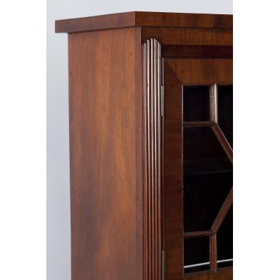 Early 19th century, finely figured mahogany veneers, cross-banded veneers, and mahogany, with poplar, white pine and mahogany secondary, the top supports a mullioned glazed single door cabinet at either end, (doweled to the case), the bowfront center section with a single door over a pair of cabinet doors flanked by a short drawer over a bottle drawer, the large cabinet doors at the ends of the case are highlighted by reeded panels, raised on six low turned feet.