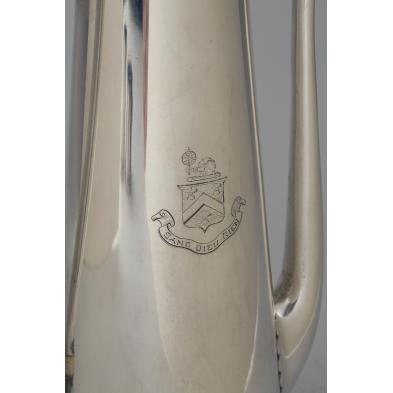 Three pieces, including: demitasse pot (8.75 in.), cream jug, and open sugar bowl. Each piece bears the Field family motto "Sans dieu rien (Without God Nothing)" beneath the family crest.