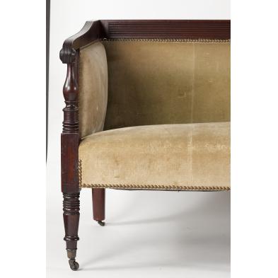 Early 19th century, Mid-Atlantic, mahogany frame with a reeded crest rail centering a rectangular frieze, the slightly down sloped reeded arms terminate in scrolls and rest atop baluster supports, the ring-turned tapering four front legs terminate in brass caps, three rear legs as made. Upholstered in light green velvet with brass nail trim.