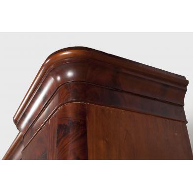 Circa 1840, five-part form, highly figured flame and crotch mahogany veneers and mahogany with predominately poplar secondary. The cove-molded cornice has rounded corners and is set over a central raised panel doors enclosing three sliding drawers over two-over-three graduated drawers, flanked by single cabinet doors, the interiors designed for hanging garments, the base frieze disguises three flush drawers. All doors with "flame point" arch decoration.