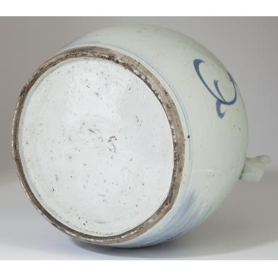 19th century, for domestic use, large globular container with small applied spout and decorative knops, with inset fitted lid, hand-painted with pine and prunus, signed below rim.