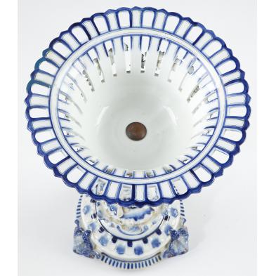 Signed on the base in blue underglaze with an "R" for decorator Helena Wolfsohn, circa 1843 - 1900, additionally blind stamped S&S, the white fields of the work are punctuated with various shades of blue, gilt accents and subtle flesh tones, the pierced bowl rests on a standard composed of two maidens, the whole set on a circular base raised on three acanthus leaf feet.