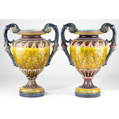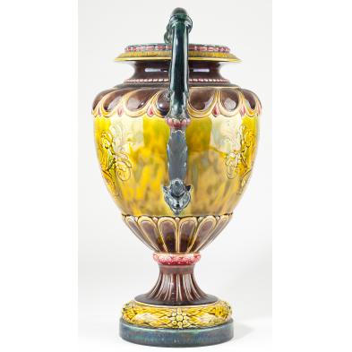 Warm mustard and brown tones with green and rose accents, double acanthus handles, incised Renaissance style mask and foliate scrollwork to body, impressed mark to base "Majolica Sarreguemines 922P."