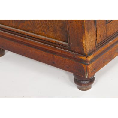 19th century, elmwood, (2) part form, the upper section with stepped molding over open shelves with brass pot hooks, the base with drawers and cupboards, raised on turnip feet.