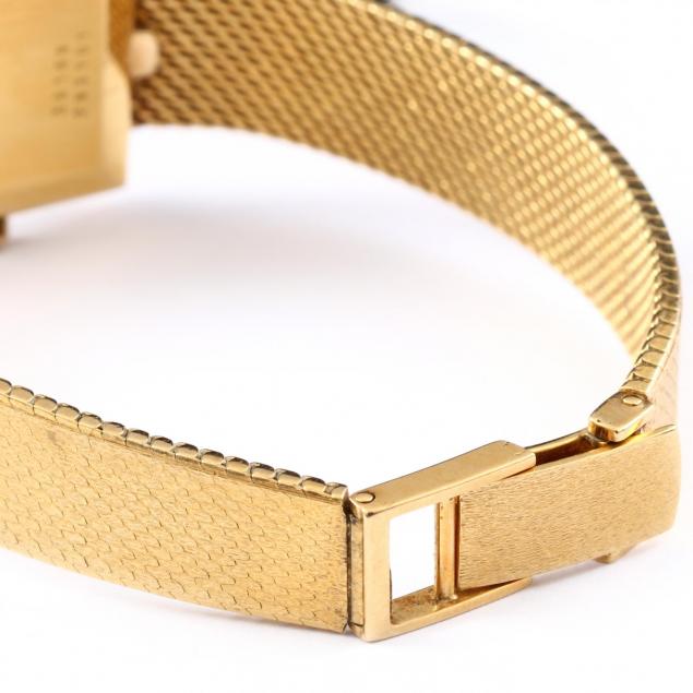 With quartz movement, the square case with signed goldtone dial and applied bar hour indexes and completed with a tapered gold mesh band marked 750 / Italy, works with 7 jewels, numbered 956031 / Swiss made, case back numbered 38189 / 293101, with Swiss hallmarks.