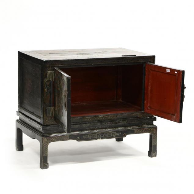Chest raised on a stand, both with black lacquer, decorated on the top with waterlilies and lotus blossoms and along the front side with Chinese figures in temple, mountain, and river landscapes.