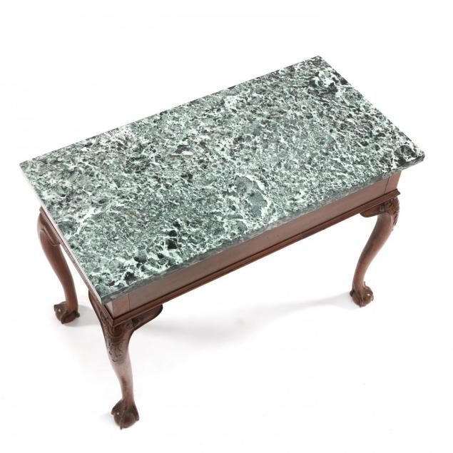Late 18th century, mahogany, rectangular form with upper and lower applied moldings to skirt, tall cabriole legs with relief carved knee to front legs, ball and claw feet.