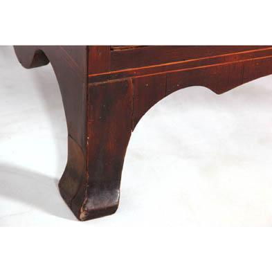Early 19th century, mahogany, poplar secondary, two part form, the top with a later broken arch pediment over two paneled hinged doors, with adjustable shelved interior, the base with upper butler desk featuring a divided interior with serpentine drawers and pigeon holes, over three graduated scratch beaded drawers, line inlaid and veneered shaped skirt and French bracket feet.
