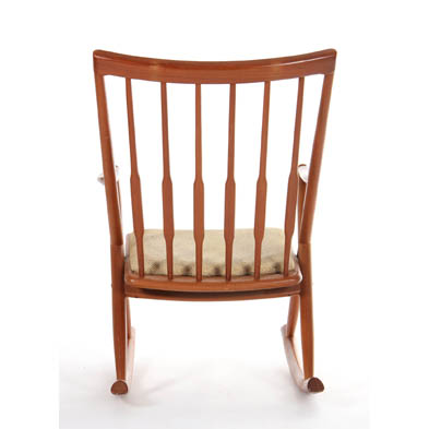 Spindle backs with cross support arms, K.D. Furniture labels, in the style of Frank Reenskaug, upholstered cushion and strap back pad.