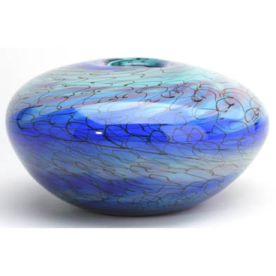 Hand-blown in cobalt, teals, and purple swirls with black looping, artist signed and dated 2007.