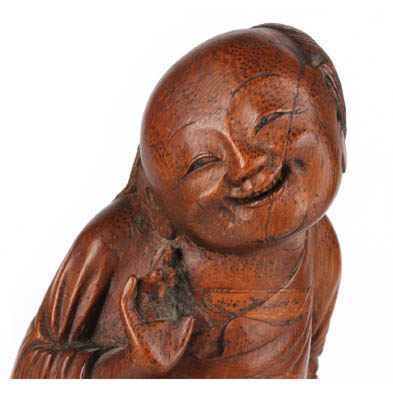 19th century or earlier, the smiling figure stands atop his three legged toad, well carved and with attractive warm brown patina.