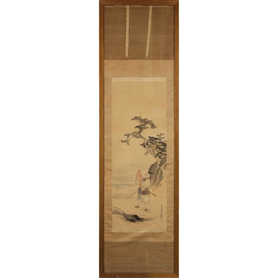 20th century, signed with seal, watercolor on fabric, possibly silk, laid to a brocade mat, the scene depicts a happy elderly warrior beholding a swathed infant in his arms. Presented behind glass in a gilt wooden frame.