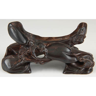 A twisted fruit or gourd is largely hidden in a mesh of untamed vines, which also host a small bat. The sculpture is presented on a custom wooden stand.