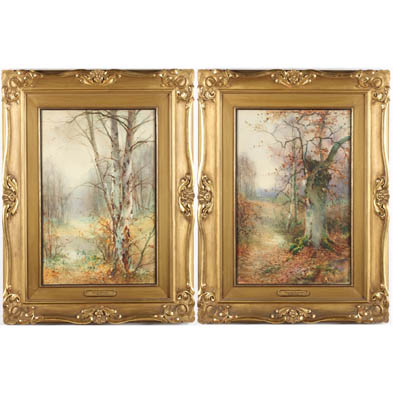 The first titled "Evening - Burnham," watercolor on paper, signed at lower right "Thomas Ireland;" the second titled "Spring Morning," watercolor on paper, signed at lower right; both in matching period gilt frames with gallery plaques, under glass.