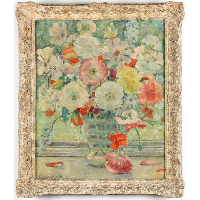 Oil on canvas, signed at lower left, presented in the likely original gilt composition frame, inscribed on the top stretcher "N. L. M. Cundell / Further Dimmings / Dorney, Windsor, Berks / 'Flowers'."