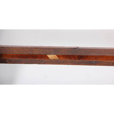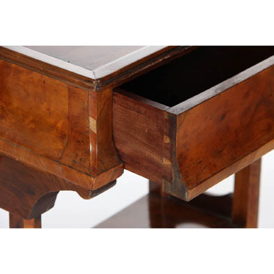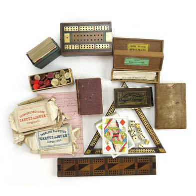 Circa 1835, mahogany and burled matched veneers, tray top, single molded drawer flanked by two adjustable mounted candlesticks, lower shelf, chamfered legs, scrolled feet, accompanied by vintage or antique cribbage, card and other game accessories.