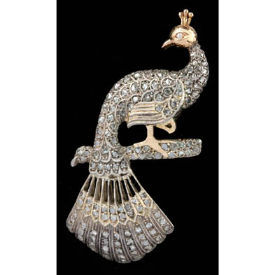 The body set with (122) point and flat cut diamonds and the eye with (1) single cut round diamond, 14KT gold crown feathers and head, completed with a vintage single pin stem and C clasp.