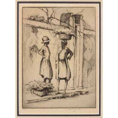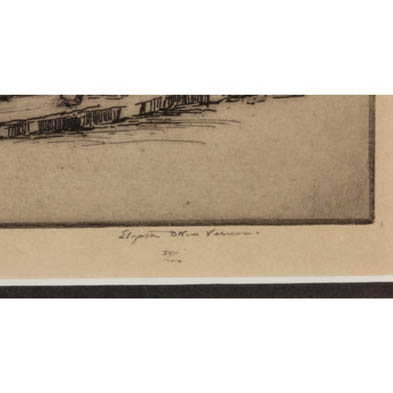 On laid paper with Vidalon watermark, titled "Rivals," pencil signed and numbered 35/100 at lower right margin, archivally matted and framed under glass. Retaining an orginal label from Rike-Kumler Company dated 5/2/39.