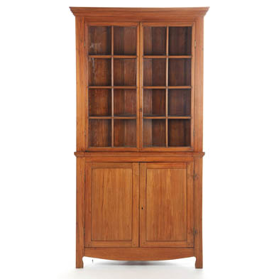 Early 19th century, Piedmont region, walnut, yellow pine secondary wood, one piece form, having a stepped molded cornice above two doors with (16) lights, high molded waist, two paneled lower doors, shaped straight foot with rear cut-out to accommodate shoe molding.