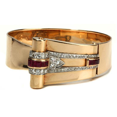 The tapered two-piece design bangle bracelet with top portion of buckle form and set with (8) square cut rubies (3.0 x 2.5mm) weighing approximately .80 total carat and (13) full cut round diamonds weighing approximately 1.32 carat (J-K color, SI1 clarity) and (36) single cut diamonds weighing approximately .72 total carat (J-K color, SI1-SI2 clarity. (Total combined diamond weight approximately 2.04 carats). The gem set buckle is detachable for use as a brooch / clip and fitted with two hinged pin stems.