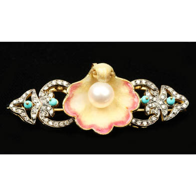 Set to the center with a finely enameled petal set with one pearl (8.0mm) having good luster and with a shaped and openwork mount set with (38) full cut round diamonds weighing approximately .35 total carat (H-I color, VS - SI2) and stamped 750. With bail for pendant wear.