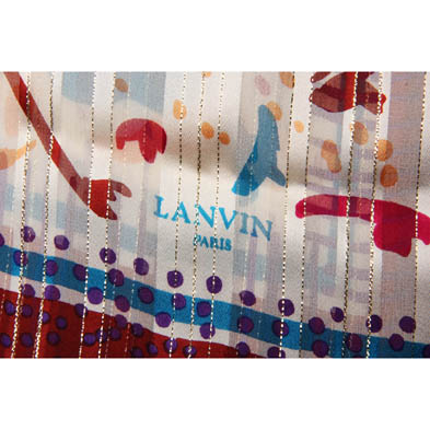 1970s-1980s, including a pair of brown leather kid skin gloves by Yves Saint Laurent, embellished with gold chain and "YSL" logo charm detailing, fully labeled to the interior, together with a lovely abstract floral sheered silk scarf by Lanvin with metallic thread detailing throughout, labeled within print "Lanvin Paris" and silk hang tag stating "Made in France."