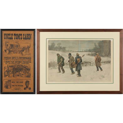 The first a hand-colored centerfold from Harper's Weekly of December 12, 1891, titled "The Music For the Dance," showing two fiddlers, a banjoist and cellist trudging through the snow to their gig. Behind glass in a wooden frame (DOA 20.75 x 27.75 in.) (very good condition); Theatrical poster for a performance of "Uncle Tom's Cabin," circa 1910, no location given. The lead illustration depicts a lively dance with banjo accompaniment. Presented in wooden frame. (DOA 22 x 11.75 in.) (fair condition with edge loss, creases and soiling).