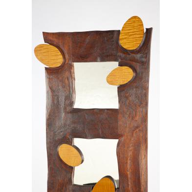 Mahogany with figured tiger maple, triple panel mirrored back, signed and dated 1997 on underside.