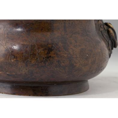 With six character Xuande mark but of later period, heavy cast bronze with lion head handles and circular footed base.