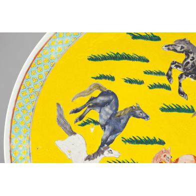 The bold yellow enameled field decorated with eight frolicking horses, teal and yellow diapered border, the underside with enameled dragons, four character Xuantong reign mark to base.