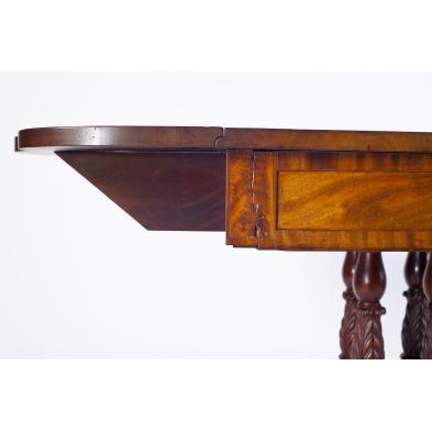 Circa 1810-30, attributed to Duncan Phyfe School, mahogany, mahogany veneers, white pine and chestnut secondary, the shaped drop leaves utilize double butterfly supports, paneled ends, supported by four turned and acanthus carved columns, raised on finely carved quadruped base terminating in brass cuffs and casters, each leaf 12 in.