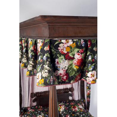 Circa 1820-30, mahogany, the tester with veneered flared cornice over veneered frieze, supported by all four tall turned reeded columns carved with tobacco leaves, drapes, and beaded design. The high headboard with scrolled ears and applied turned and carved crest ending with melon shaped finials, raised on block and baluster reeded and tapered legs with brass ball feet. Sold together with custom floral valence, cover, pillows, and skirt. Rail height 21 in., interior: 50.5 x74 in.