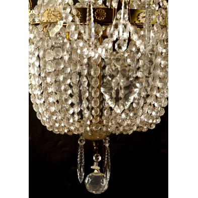 Six arms each with bobeche and drop prisms, gilt tone frame with leaf accent, seag prisms with lower basket form having a central drop prism.