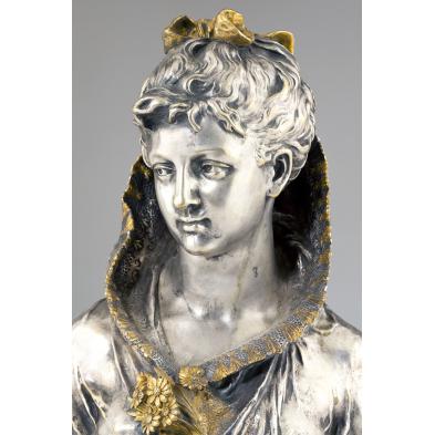 Bronze bust of a young beauty attired in a lace edged shawl and nosegay, applied silver gilt finish, pedestal and socle base, signed on the side "Moreau Math Hors-Concours".