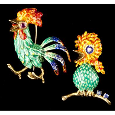 The first designed as a whimsical bird with diamond melee accent (1.25 in.); the second designed as a rooster with a ruby eye accent (1.5 in.).