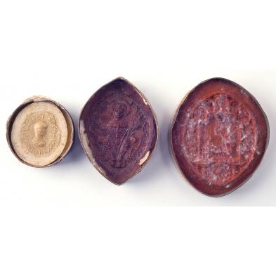 To include (4) plaster copies of seals and (10) plaster impressions coated to imitate various shades of seal wax. This labeled collection, once owned by Bruno Bitter (1898 - 1987), a German Jesuit priest working in Japan, represents European municipal, educational and religious institutions of the late Medieval and Renaissance periods. Presented in their original hinged box with old photocopies showing seal collections.