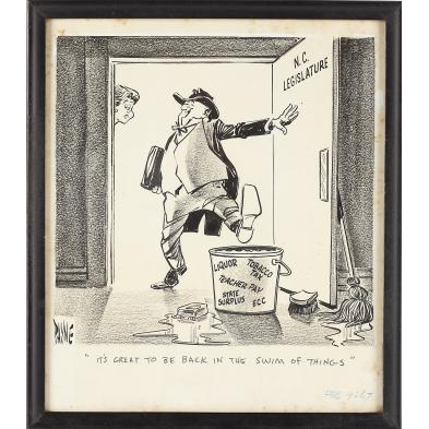All signed original art, to include: (4) by Eugene Payne of the Charlotte Observer; (1) by Bob Zschiesche of The Greensboro Daily News and (1) by Sandy Huffaker of The News and Observer. Each cartoon is presented in a plain black wooden frame. Bob Scott (1929 - 2009), of Alamance County and son of W. Kerr Scott, served as the Governor of North Carolina from 1969 to 1973.