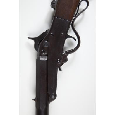 First Model, late 1850s, .50 caliber breechloader, 20 in. barrel with octagonal breech, 36.75 in. overall length, walnut stock, all iron mountings, primer mechanism under hinged lid on right side, patchbox stamped MAYNARD PATENTEE / SEP 22, 1845 / MAY 27, 1851 / JUNE 17, 1856, frame stamped MAYNARD ARMS CO. / WASHINGTON on right and MANUFACTURED BY / MASS. ARMS CO., CHICOPEE FALLS on left, fixed front sight and folding rear sight on the tang. The right side of the stock is marked by two soldiers with "WR," and "W. W. Anthony"; the left side of the stock is carved with "T J WEBB." The initials here are entirely too cryptic to research, however the full names might be those of two Tennessee soldiers captured at Fort Donelson on February 16, 1862. A Private William W. Anthony was in Co. "K," 3rd (Clack's) Tennessee Infantry while Thomas J. Webb was a private in Co. "F," 32nd Tennessee Infantry. There were other soldiers with these names, of course, and further research might or might not yield another pair serving together.