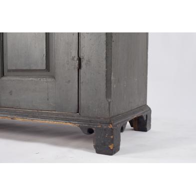 Poplar, possibly North Carolina, the case with applied cove molded cornice over two doors each with three raised molded panels within a molded frame flanked by chamfered corners, raised on a spurred bracket foot base. The right halves of the interior shelves were reduced to allow space for hanging garments.