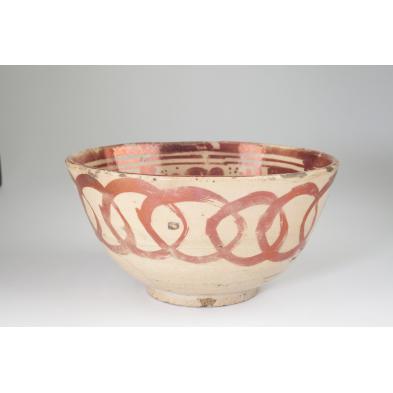 Spain, earthenware decorated with interconnected circles on the exterior and on the interior with a large bird surrounded by fruit and leaves, copper lustre glaze.