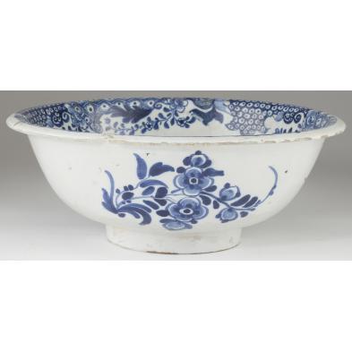 Second half 18th century, tin glazed earthenware likely from Liverpool. The bottle is of globular form with a tall neck, decorated in blue with large flower heads and diaper pattern below the spout (9.75 in.). The basin is decorated in the Chinese taste both interior and exterior, the bowl raised on a short straight foot (4 x 10 5/8 in.). An assembled set.