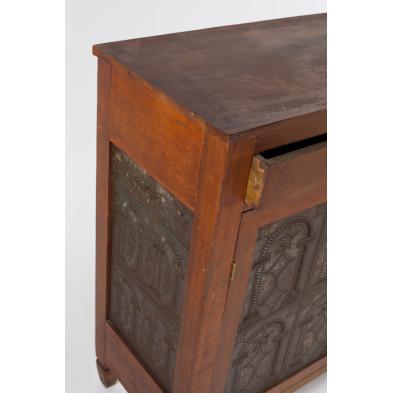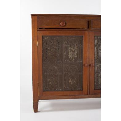 Washington or Greene County, mid-19th century, walnut, yellow pine and poplar secondary woods, the case with two side-by-side drawers over two cupboard doors decorated with hand-punched tins in the form of arches and stars, conforming side tins for a total of four panels, raised on tapered block feet.