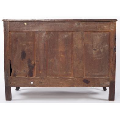 18th century, walnut, one top with molded edge over relief carved frieze centered with a basket, the case with two hinged doors having shaped inset panels, paneled sides, well developed skirt with central relief carved urn, raised on short cabriole feet. High quality steel hinges with acorn finials, applied steel elongated escutcheons.