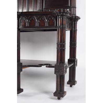 Late 19th century, mahogany, applied tall backsplash (22.5 inch) centered with three Gothic arches flanked by solid panels over pierced quatrefoil panels. The case, with shaped top over three side-by-side drawers decorated in the Gothic theme, divided by clustered Corinthian column tall legs, lower molded shelf with cut-out trefoils, raised on casters.
