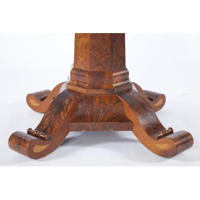 Circa 1830s, figured mahogany veneers, shaped top, skirt with beaded low border, faceted central column on quadruped base, each foot with the inlaid rain drop to the side.